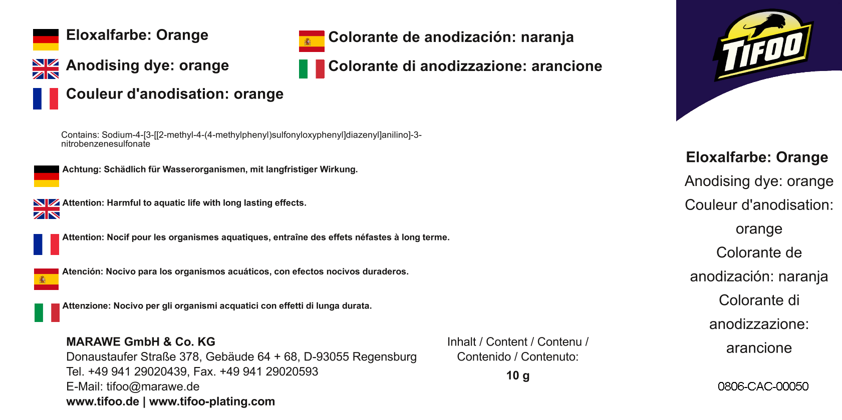Das Finish für eine gelungene Eloxierung stellt die abschließende Färbung dar. Wir bieten Ihnen hier exklusive Eloxalfarben höchster Qualität. Tifoo Eloxal Orange ermöglicht die Einfärbung der Eloxalschichten in verschieden starke Orange Töne. Rühren Sie den Farbstoff einfach in die gewünschte Menge destilliertes Wasser (an jeder Tankstelle erhältlich) ein.