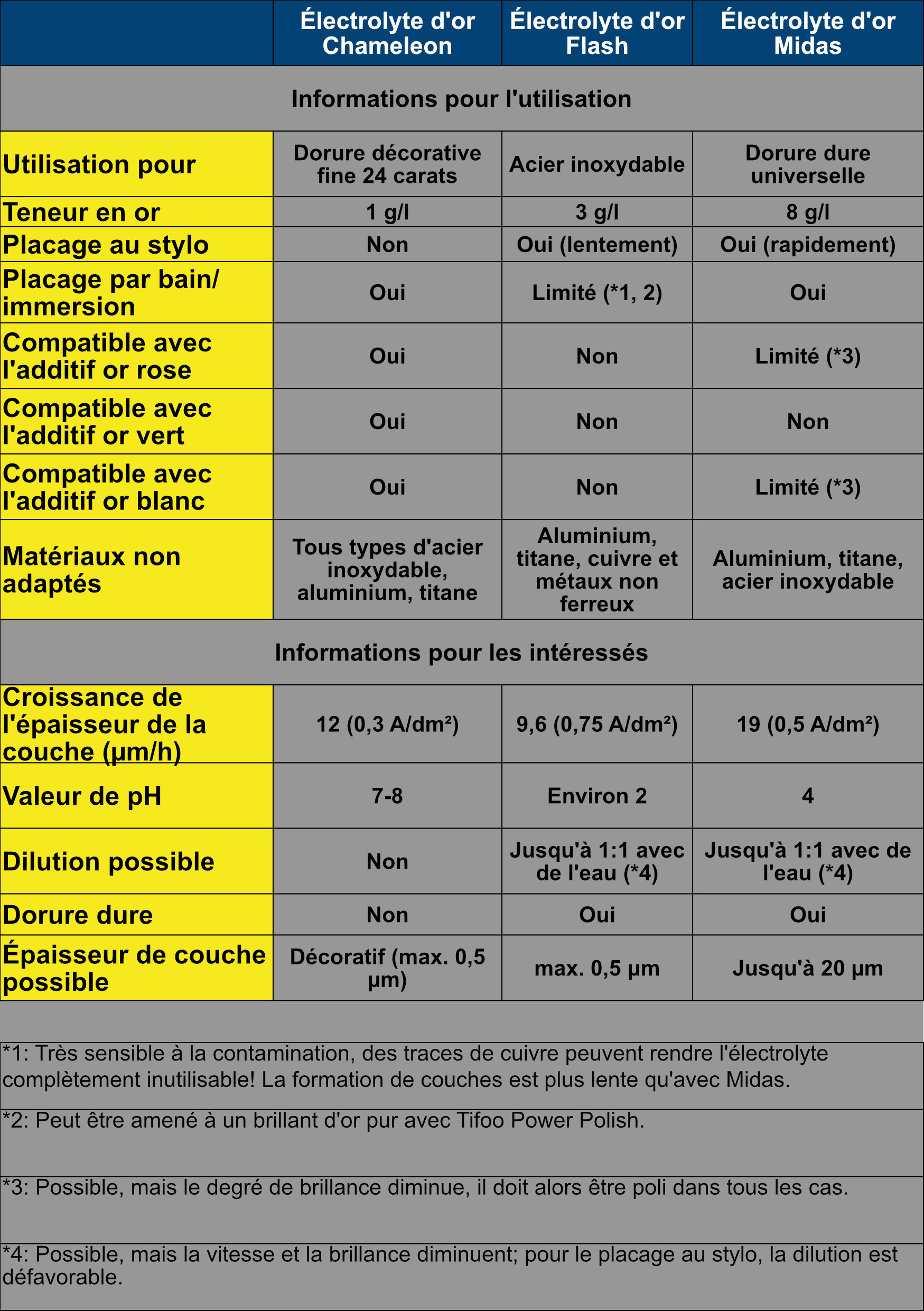 Un aperçu rapide des propriétés et des détails techniques des différents électrolytes d'or de la gamme Tifoo se trouve dans le tableau suivant :