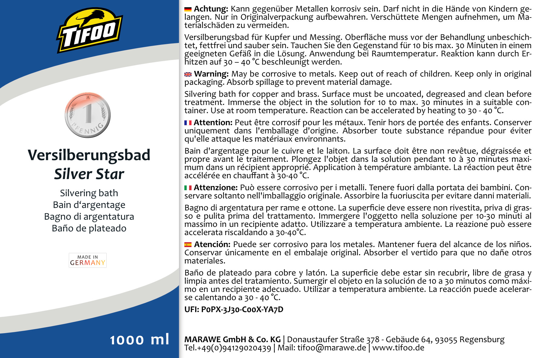 Le Tifoo Silver-Star Bain d'immersion d'argenture permet l'argenture de cuivre et laiton dans peu de minutes. Le Tifoo Silver-Star permet aussi de restaurer de vieilles pièces de monnaie, des objets décoratifs et des objets d'art sans problèmes. L'application du Silver-Star est assez simple: immergez l'objet à argenter dans un bain de Tifoo Silver-Star et dans peu de temps, il y aura une couche brillante et résistante d'argent. Dans l'idéal, l'objet à argenter est d'abord nettoyé et dégraissé soigneusement. Pour le cuivre ou les métaux lourds non-ferreux, nous recommandons particulièrement le Tifoo Nettoyant cuivre, qui est aussi disponible sur notre site marchand. Veuillez lire bien les instructions avant le premier usage. Si vous avez des questions, nous nous tiendrons volontiers à votre disposition.