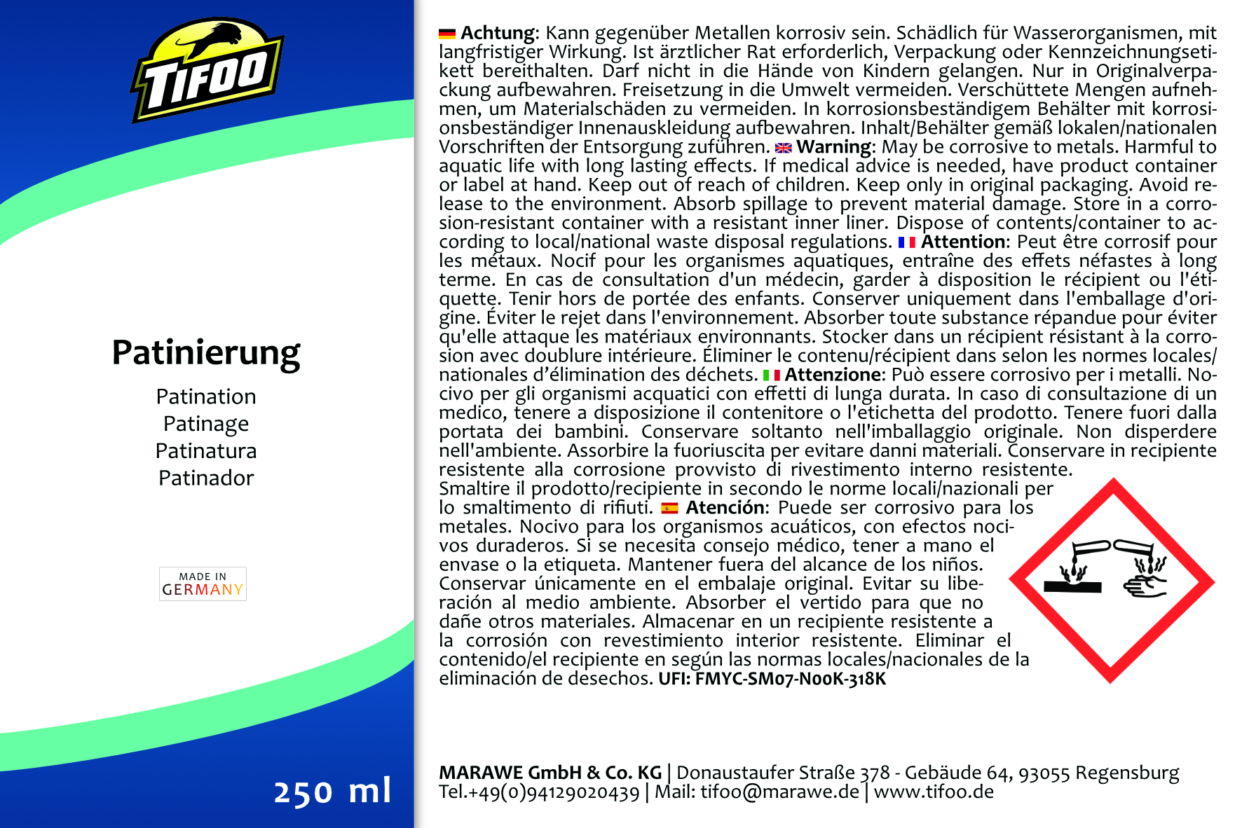 Vous pourrez vous-même patiner vite et facilement du cuivre, du laiton et du bronze. Une fois entré en contact avec du cuivre ou laiton nus et nettoyés, le patinage de Tifoo vous permettra de distinguer une couche de couleurs bleu nuit jusqu'à noir foncé. Patinage simple et rapide de laiton, cuivre ou bronze pour regarder en direct ! Au moment où la teinture souhaitée soit achevée, veuillez terminer le patinage et lavez l'objet avec de l'eau. En ajoutant d'autres diverses substances, on peut achever d'autres effets de couleur intéressants. Il n'est pas nécessaire de faire chauffer le patinage et il ne contient pas de solution alcaline.