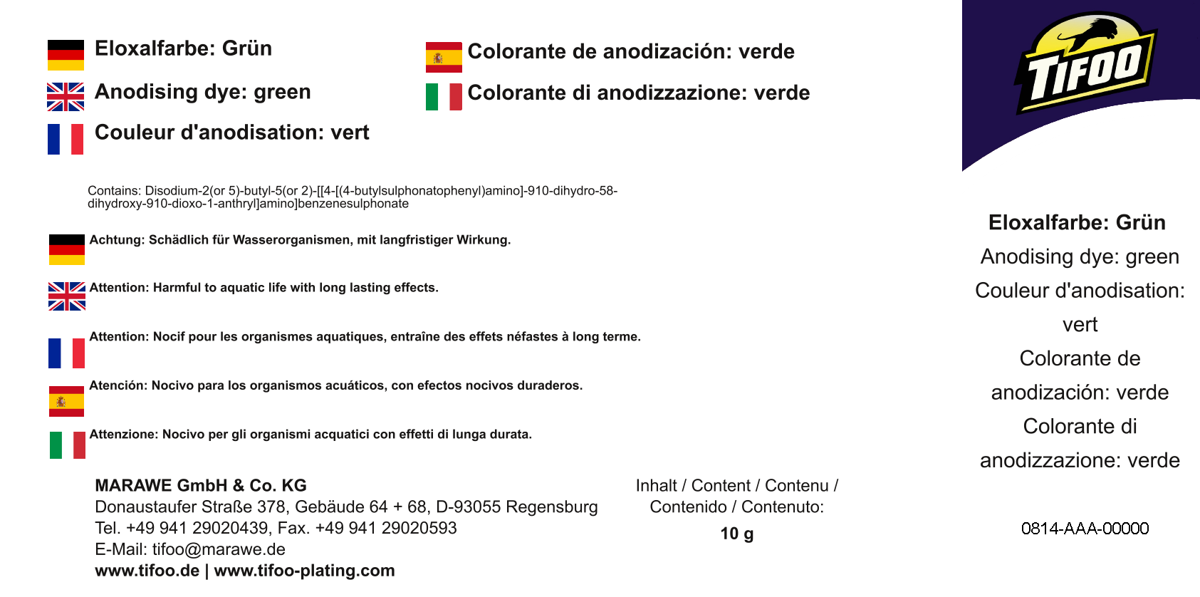Il tenore finale per unanodizzazione riuscita costituisce la colorazione definitiva. Le offriamo qui dei colori Eloxan esclusivi di altissima qualità. Il verde Eloxal di Tifoo consente la colorazione degli strati Eloxal in diversi toni di colore forti. Mescoli il colorante semplicemente nella quantità di acqua distillata (disponibile in ogni distributore) desiderata.